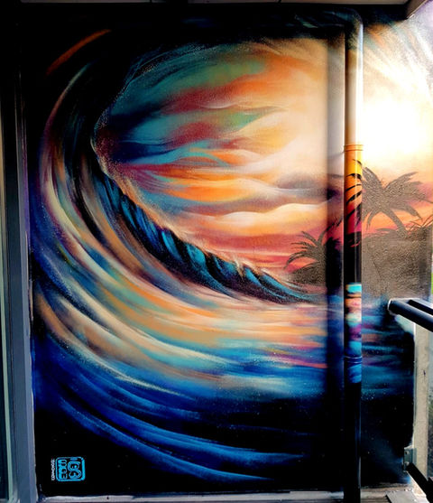 A fresco made for surfing enthusiasts. A young couple wants to bring life to their sad balcony by adding a magnificent wave in the colors of the sunset.