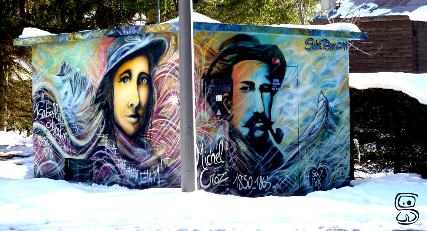 To celebrate 150 years of mountaineering in Chamonix. A commemorative fresco in homage to Michel Croz, the first to reach the summit of the Matterhorn, who would not come down alive. And Isabella Straton, one of the first female mountaineers who gave her name to the Pointe Isabelle in the massif, married to a local guide.