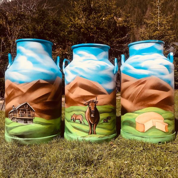 Customisation de Boilles de Lait à la bombe de Peinture et à la peinture acrylique réalisées pour la Coopérative de Beaufort. Thème des alpages, des vaches et du fromage.